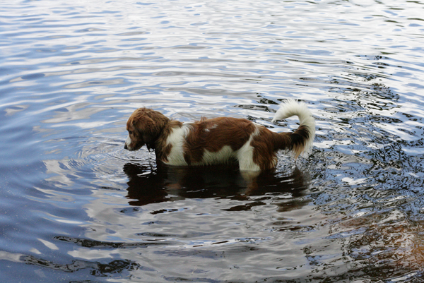Tänään lähdettiin käymään mökillä. Illusia sai taas juosta mielin määrin, ei haitannut pieni vesisadekaan. Illusia nautti vedessä kahlaamisesta, mutta hauskinta oli kepin hakeminen vedestä!